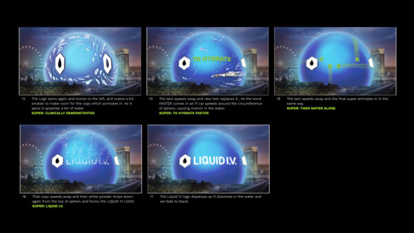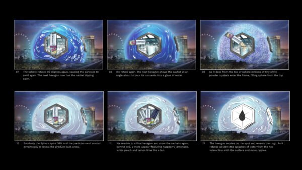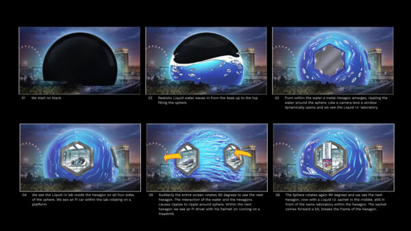 Factory Fifteen partnered with Nexus Studios to celebrate Liquid I.V.’s Formula 1 sponsorship with an eye popping experience for the Sphere. The molecule/shaped hexagon was used as a window into the Liquid I.V. laboratory where hydration meets science. Outside of this window the Sphere was used as a container filling with water, spinning to transition between the different scenes inside the laboratory and eventually to mix the powder coming from the sachet, keeping a bold, fun and sciency mood to represent the defining characteristics of the brand.