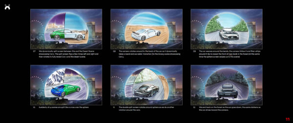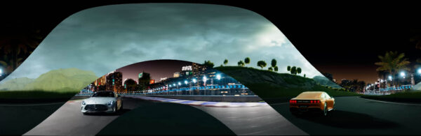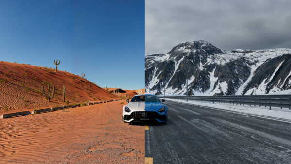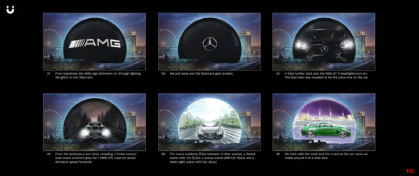 Between four distinct environments, we pioneered an innovative 360° perspective environment designed to keep the focus sharply on each featured GT model, which includes the AMG GT 63, AMG GT 63 APXGP Edition, and AMG CONCEPT AMG GT XX. The result is a fluid, panoramic experience that gives audiences a dynamic, lifelike view with the north view car driving toward the audience while the south view car drives away. We deployed a custom camera rig. This rig links the rotation of the camera around the car to the 360° environment render, ensuring that when the view rotates, both the car and the scene match perfectly.